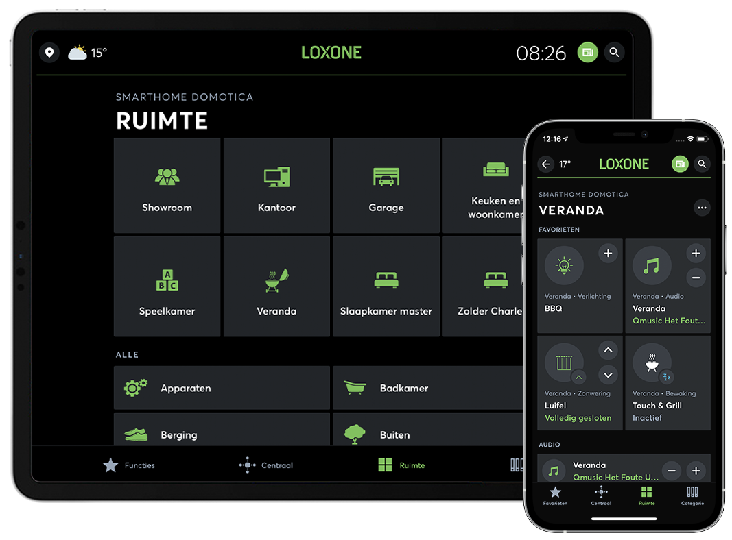 Met de Loxone App heeft u alle functies van een intelligente woning compact en duidelijk in één hand. De Loxone App biedt toegang tot verlichting, zonwering, muziek, beveiliging en klimaatregeling, zelfs als u onderweg bent. En het is helemaal gratis!